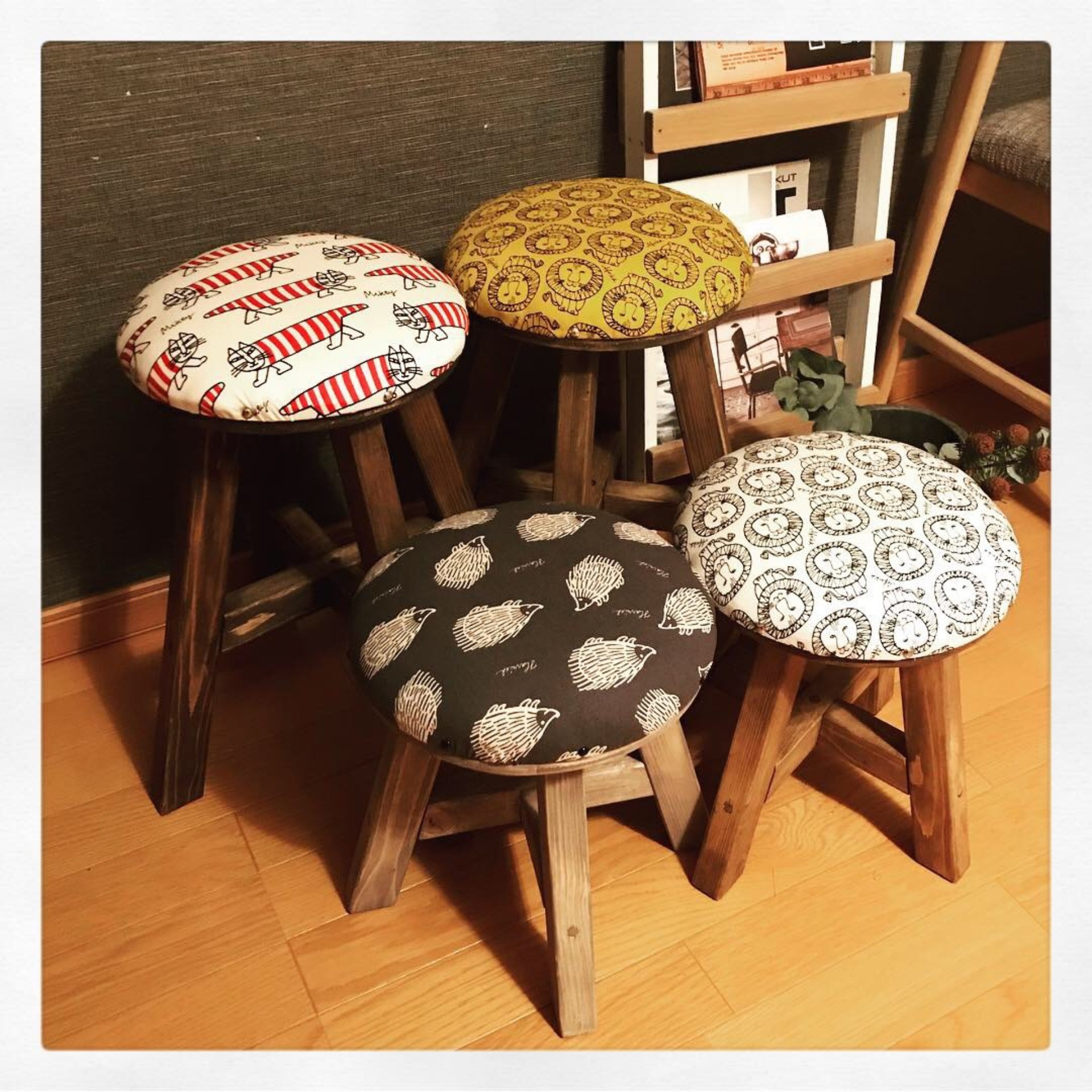 当工房のオーダーメイドスツールは、お客様にイスの形や素材、高さなどをお選びいただいて制作いたします。また、昔着ていて捨てるに捨てられない服など素材をいただければ、思い出の品を使用したスツールに仕上げることも可能になります。